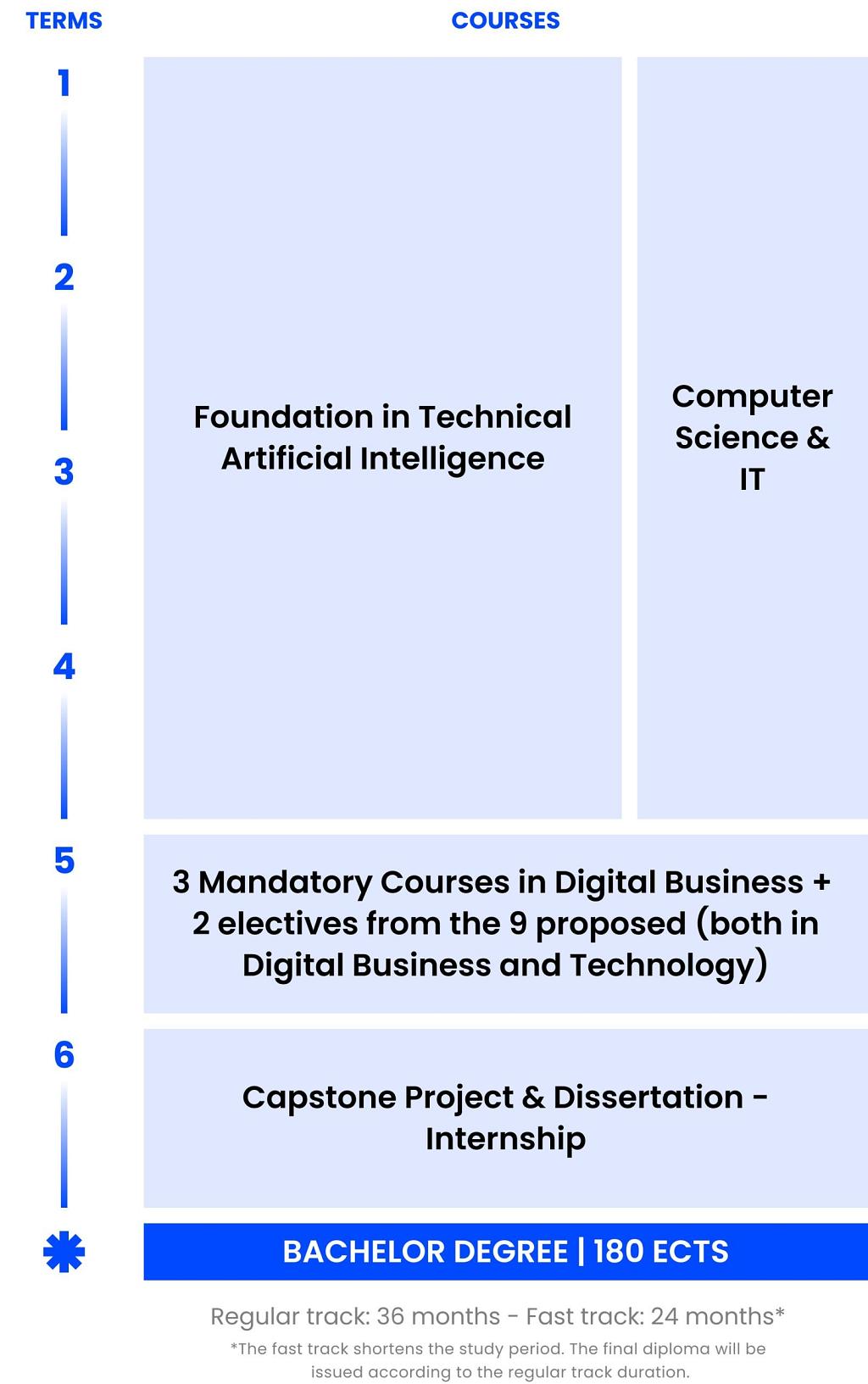 The Bachelor’s is structured with 5 Terms of courses and 1 final Term for the dissertation/project. In Term 5, you have 3 compulsory modules in Digital Business and can then pick 2 elective courses out of 9 based on your interests.