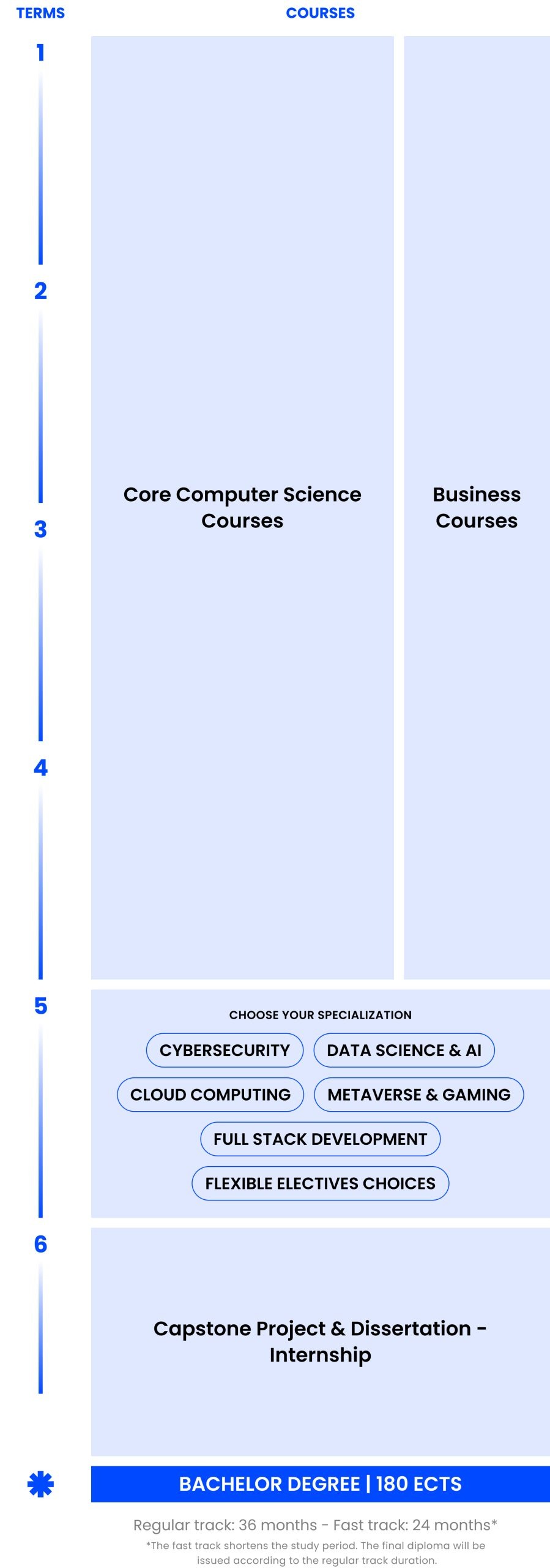 The Bachelor’s is structured with 5 Terms of courses and 1 final Term for the dissertation/project. Every Term lasts 13 weeks.