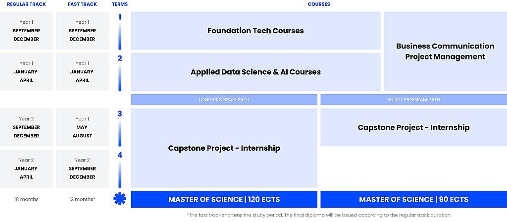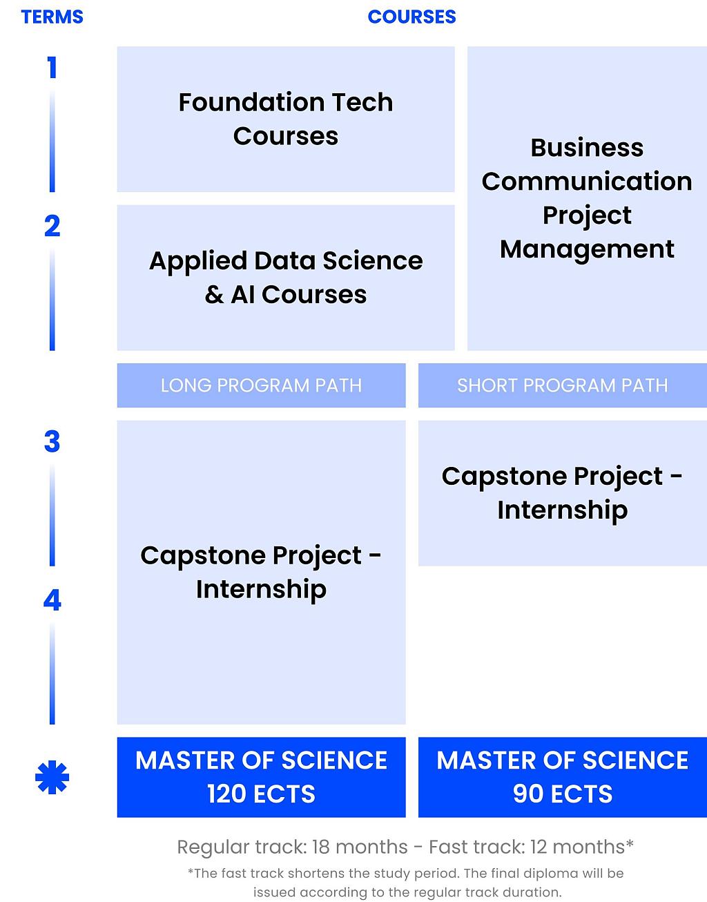 This MSc degree does not require previous knowledge in Data Science and AI. The program is structured so that students coming from a non-tech background will be introduced to foundational concepts during Term 1.