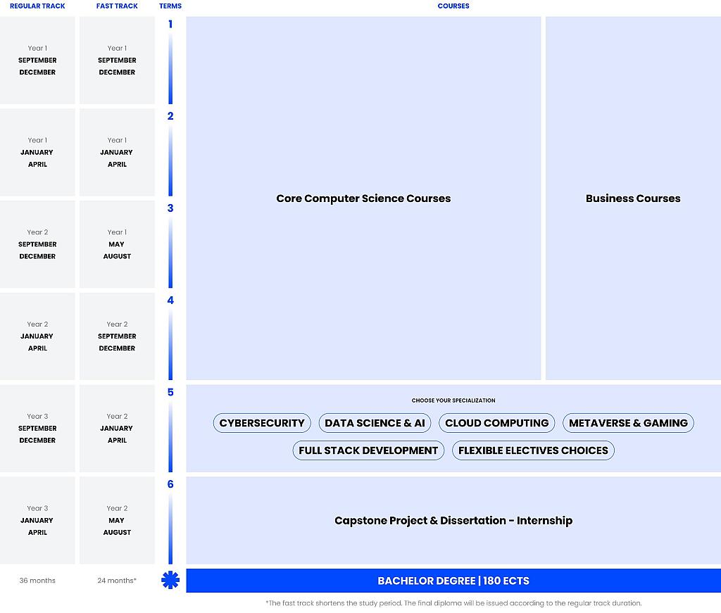 The Bachelor’s is structured with 5 Terms of courses and 1 final Term for the dissertation/project. Every Term lasts 13 weeks.